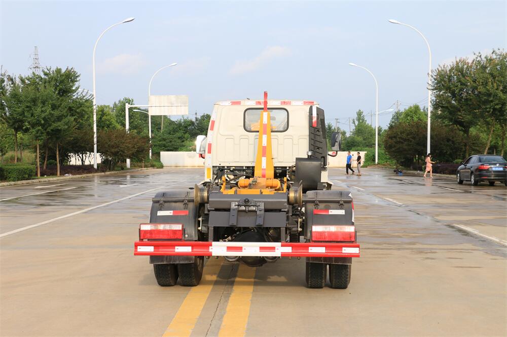 勾臂式垃圾車(車廂可卸式垃圾車)介紹: 車廂可卸式垃圾車又叫拉臂式垃圾車,是一種采用高新設計可伸縮的鉤臂,實現垃圾廂的二次吊裝,自吊上放下,可自行傾倒垃圾的環衛設備。 拉臂式垃圾車結構簡單,操作穩定方便,裝卸效率高,機械化程度高,節省人力。鉤臂垃圾車一車可帶多個垃圾廂,在裝卸的運輸過程中可有效地避免二次污染。 拉臂垃圾車采用高新設計可擺動的鉤臂,垃圾箱由框架、開啟油缸、滑輪、后門和若干加強框架與鋼板焊接而成。調換貨廂快捷方便,貨廂上帶蓋(倒垃圾時可翻開),鉤臂垃圾車垃圾廂體可選用碳鋼、不銹鋼材質、內部采取環氧樹脂防腐處理,改裝部分與原車底盤為可分離式,維修方便且保持了原車的機動性及行駛性能。