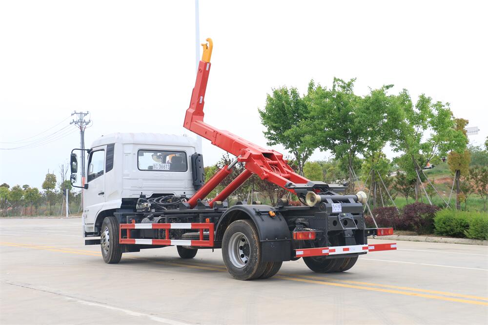 勾臂式垃圾車(車廂可卸式垃圾車)介紹: 車廂可卸式垃圾車又叫拉臂式垃圾車,是一種采用高新設計可伸縮的鉤臂,實現垃圾廂的二次吊裝,自吊上放下,可自行傾倒垃圾的環衛設備。 拉臂式垃圾車結構簡單,操作穩定方便,裝卸效率高,機械化程度高,節省人力。鉤臂垃圾車一車可帶多個垃圾廂,在裝卸的運輸過程中可有效地避免二次污染。 拉臂垃圾車采用高新設計可擺動的鉤臂,垃圾箱由框架、開啟油缸、滑輪、后門和若干加強框架與鋼板焊接而成。調換貨廂快捷方便,貨廂上帶蓋(倒垃圾時可翻開),鉤臂垃圾車垃圾廂體可選用碳鋼、不銹鋼材質、內部采取環氧樹脂防腐處理,改裝部分與原車底盤為可分離式,維修方便且保持了原車的機動性及行駛性能。