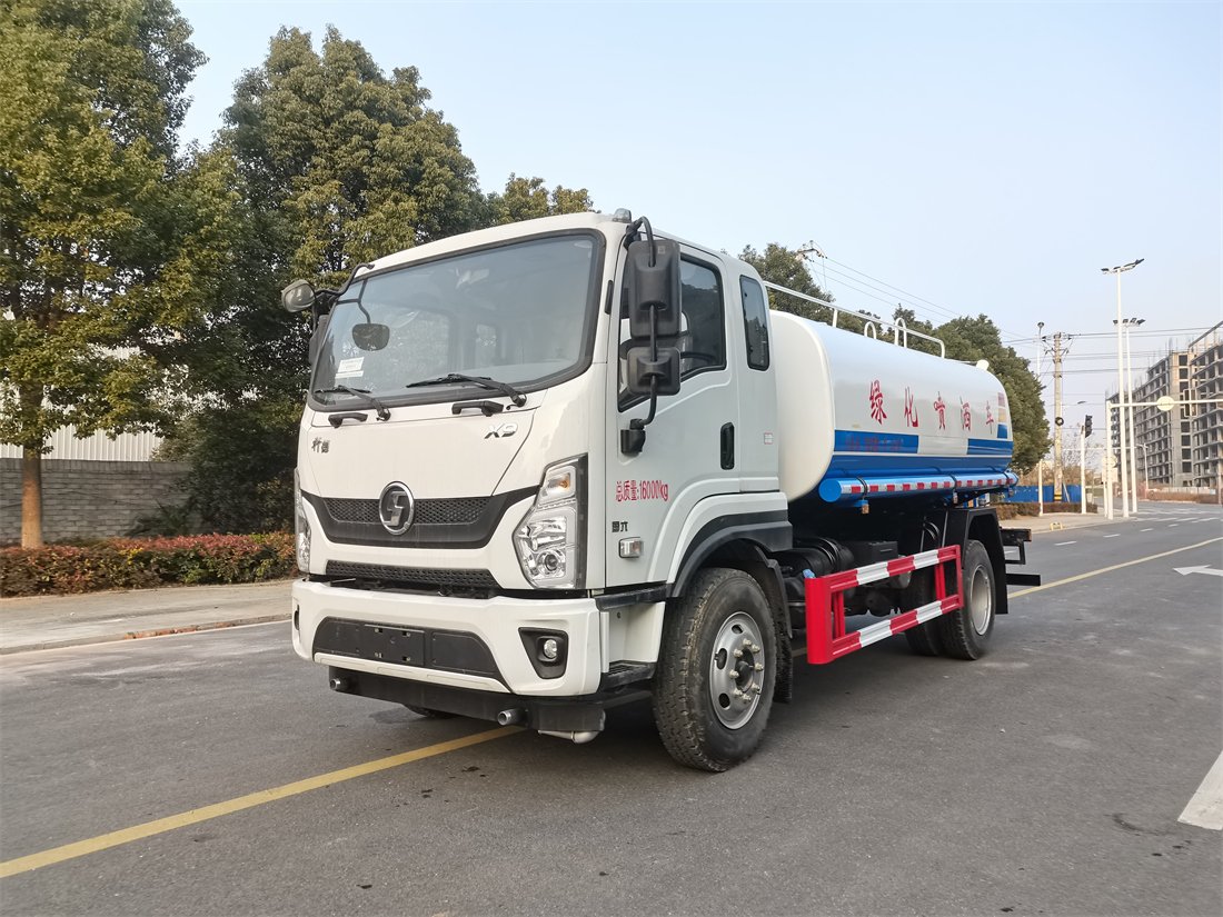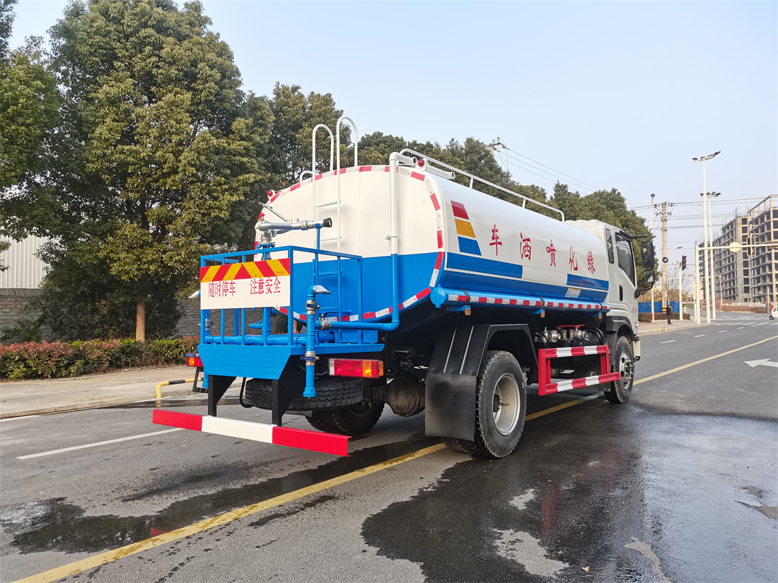 灑水車前裝有鴨形噴嘴或圓頭沖嘴,后面裝有圓柱開灑水噴嘴或蓮蓬頭噴嘴,后部有一工作平臺,裝配有水炮。后部還可裝8個噴嘴(選裝)。