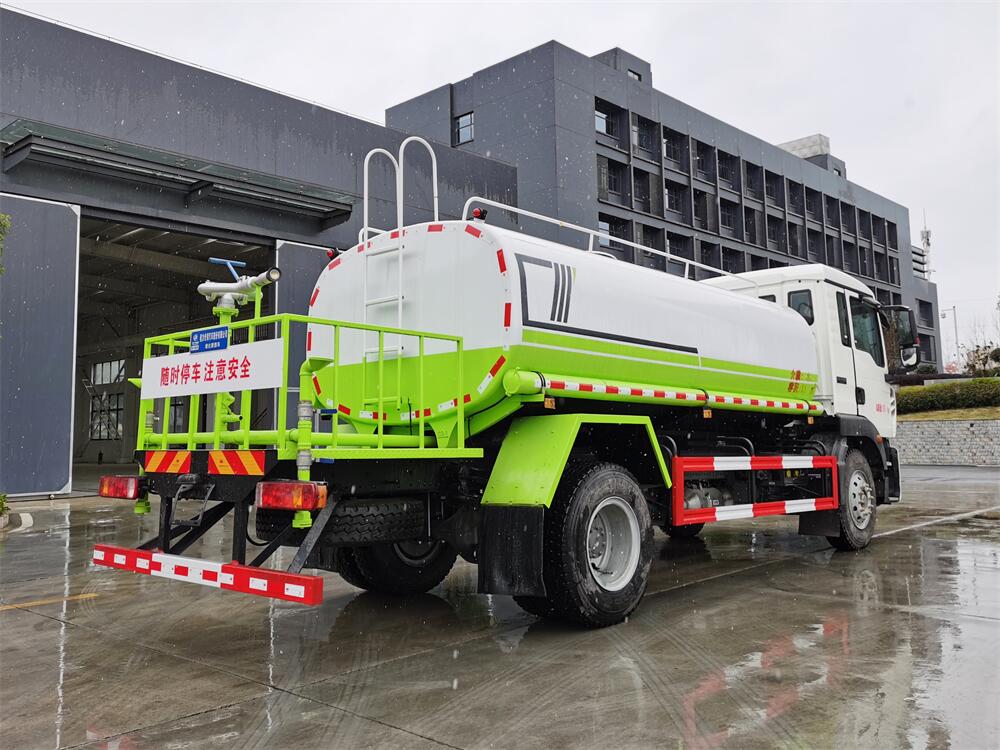 灑水車前裝有鴨形噴嘴或圓頭沖嘴,后面裝有圓柱開灑水噴嘴或蓮蓬頭噴嘴,后部有一工作平臺,裝配有水炮。后部還可裝8個噴嘴(選裝)。