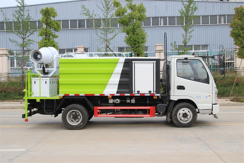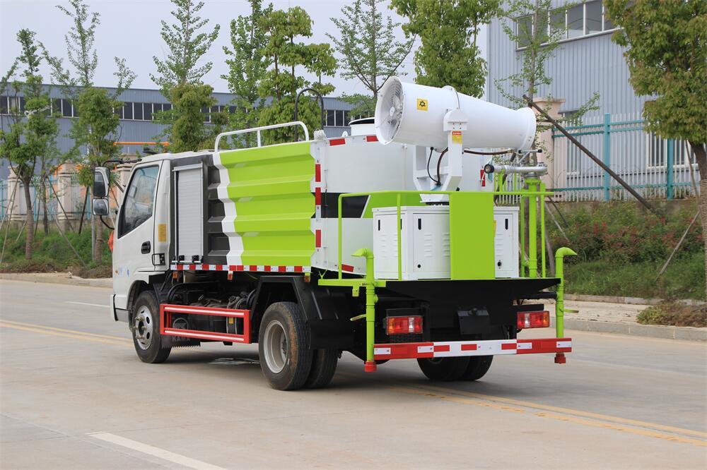 上裝配置:罐體容積為 5立方,選配風(fēng)送式霧炮機(jī)組射程30米、40米、50米、60米、80米、100米、120米霧炮,罐體鋼板為4mm碳鋼Q235材質(zhì),罐內(nèi)隔板具有防波作用,以減輕汽車行駛時(shí)罐體液體沖擊,罐體及整車外形尺寸按照公告。帶大功率專用灑水泵,泵可自吸自排,整車前沖、后灑、側(cè)噴、帶65消防接口,后平臺(tái)配CLW-50、CLW-60、CLW-80、CLW-100、CLW-120型風(fēng)送式霧炮機(jī)組;罐體前封頭配大功率柴油發(fā)電機(jī)組;前封頭帶水位計(jì),后平臺(tái)主管路帶1寸澆花接口,后爬梯。帶兩根輸水管及陰陽端。罐體顏色:銀/灰/綠,罐體兩側(cè)噴“多功能抑塵車”字樣,貼反光標(biāo)示。