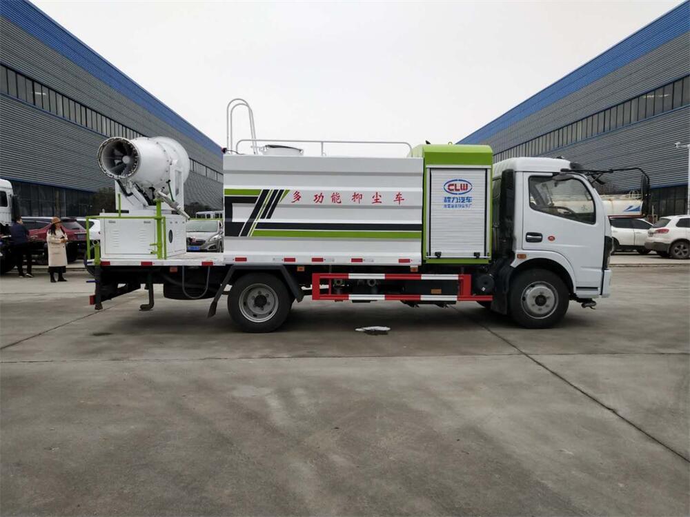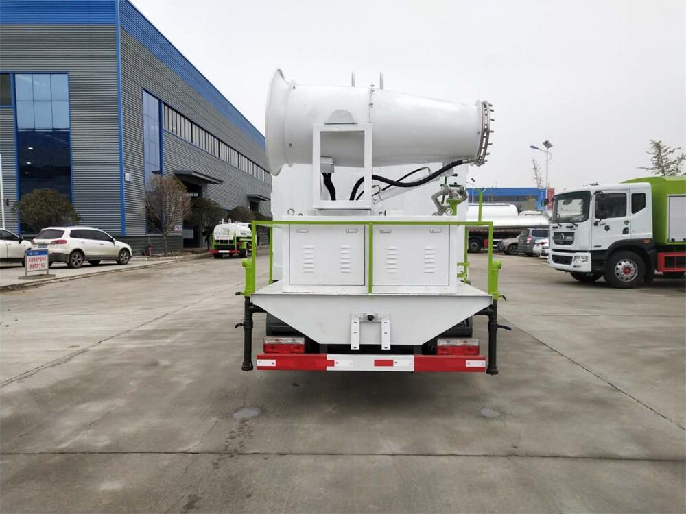 上裝配置:罐體容積為 8立方,選配風送式霧炮機組射程30米、40米、50米、60米、80米、100米、120米霧炮,罐體鋼板為4mm碳鋼Q235材質,罐內隔板具有防波作用,以減輕汽車行駛時罐體液體沖擊,罐體及整車外形尺寸按照公告。帶大功率專用灑水泵,泵可自吸自排,整車前沖、后灑、側噴、帶65消防接口,后平臺配CLW-50、CLW-60、CLW-80、CLW-100、CLW-120型風送式霧炮機組;罐體前封頭配大功率柴油發電機組;前封頭帶水位計,后平臺主管路帶1寸澆花接口,后爬梯。帶兩根輸水管及陰陽端。罐體顏色:銀/灰/綠,罐體兩側噴“多功能抑塵車”字樣,貼反光標示。