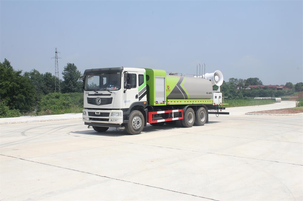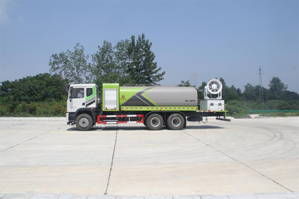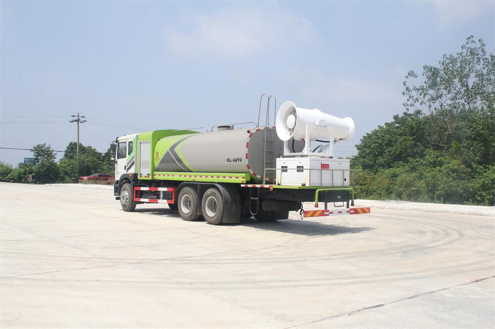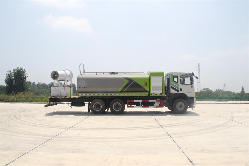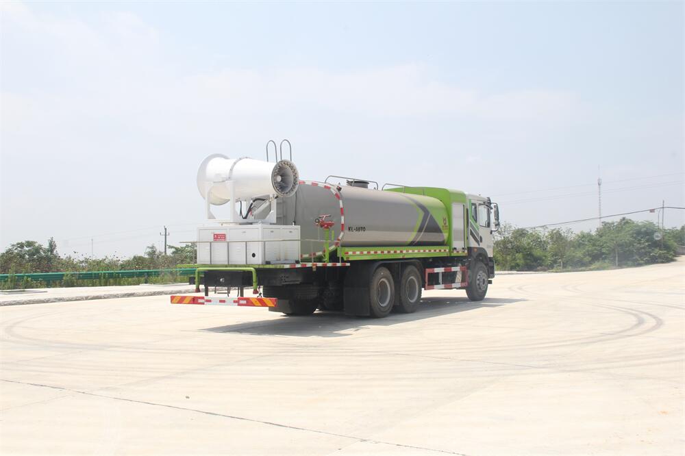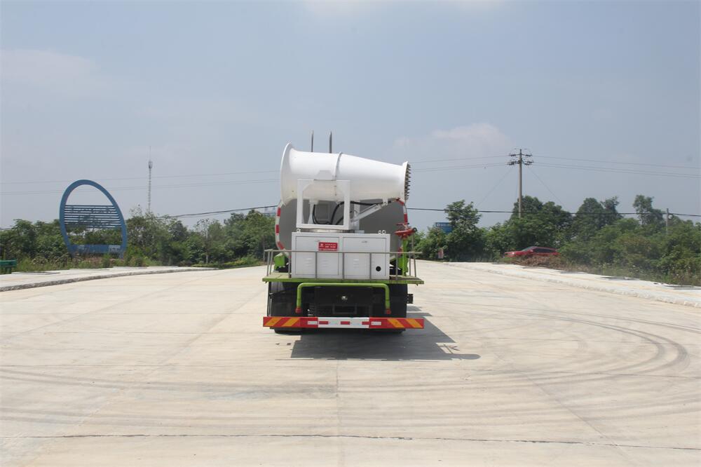 上裝配置:罐體容積為 16立方,選配風送式霧炮機組射程30米、40米、50米、60米、80米、100米、120米霧炮,罐體鋼板為4mm碳鋼Q235材質(zhì),罐內(nèi)隔板具有防波作用,以減輕汽車行駛時罐體液體沖擊,罐體及整車外形尺寸按照公告。帶大功率專用灑水泵,泵可自吸自排,整車前沖、后灑、側(cè)噴、帶65消防接口,后平臺配CLW-50、CLW-60、CLW-80、CLW-100、CLW-120型風送式霧炮機組;罐體前封頭配大功率柴油發(fā)電機組;前封頭帶水位計,后平臺主管路帶1寸澆花接口,后爬梯。帶兩根輸水管及陰陽端。罐體顏色:銀/灰/綠,罐體兩側(cè)噴“多功能抑塵車”字樣,貼反光標示。